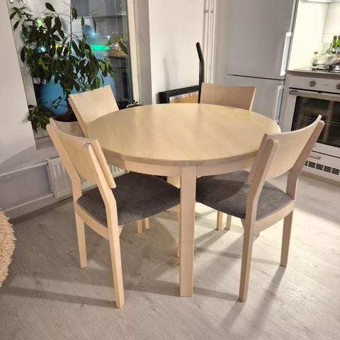 Pohjanmaan kalusteen valmistamat laadukkaat ja kestävät kalusteet. Väri pähkinä. Savuton ja eläimetön talous. Ruokapöydän kansi 89,5x140 ja korkeus 76 cm. Penkki 95x40 ja korkeus 45,5 cm. Voin myydä penkin myös erikseen. Vain nouto. Nyt edullisesti nopeimmalle muuton vuoksi!
