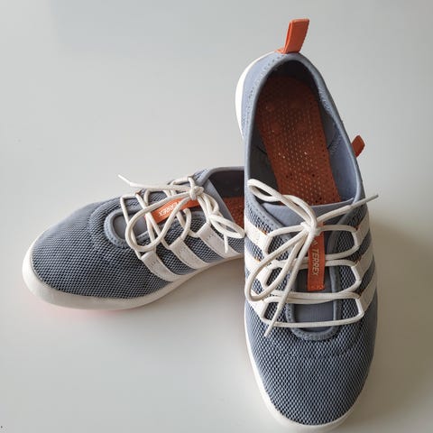 Adidaksen kevyet kengät kesään ja urheiluun. Hyvä pito pohjissa. Pohjissa reijitys, jotta vesi pääsee ulos kengistä. Kengät pesty. Vastaa kokoa 39. Käytetty vaate.