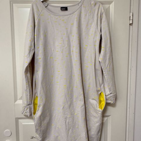 Papun ihana pitkähihainen nakkimekko koossa M. Sivuilla taskut. Pohjaväri musta, nakeissa aavistuksen vaaleanpunertava sävy. Erittäin hyvä kunto, ainut vika minkä löysin on lähes olematon reikä taskun kohdalla (kuvassa nuppineulan kärki osoittaa reikää). Savuton ja eläimetön talous.