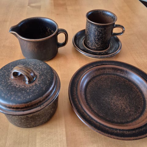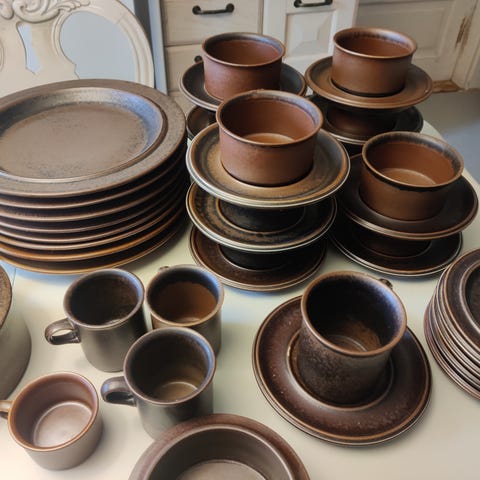 Hyväkuntoinen Arabia Ruska -asiasto. Osassa leima kulunut/puuttuu (katso kuvat). Ollut vähällä käytöllä, mutta joistain astioista löytyy käytön jälkiä.