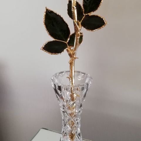Täydellisessä kunnossa ja alkuperäisessä pakkauksessa oleva aito punainen ruusu, jossa takaosa, lehtien ja terälehtien reunat on kullattu 24 karaatin kullalla. Ruusu on kauttaaltaan päällystetty niin että se säilyy ikuisena. La Belle Collection -merkki. Ostettu aikoinaan kultasepänliikkeestä.