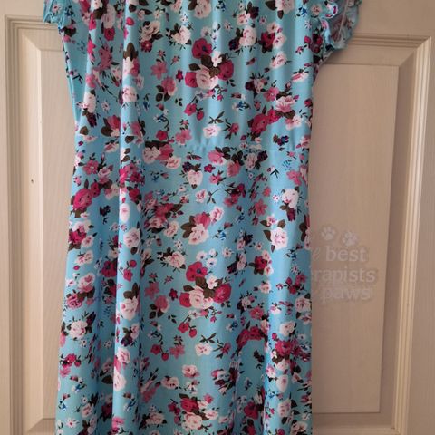 Myydään kuvan kukkamekko volangilla. Musta pohjaväri, kukkaset roosa. Lyhythihainen. Käyttämättä jäänyt. Laput irrotettu aikoinaan, mutta ei koskaan käytetty. Savuton ja eläimetön talous.