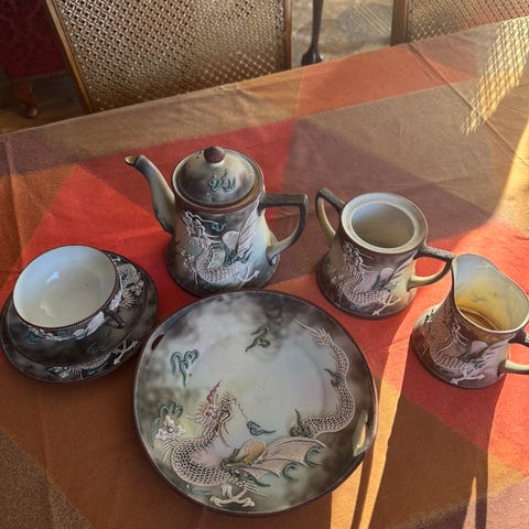 Hyväkuntoinen tee-astiasto lintukuviolla.