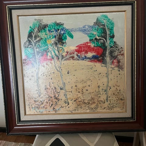Martti Väisäsen taulu 1996, ei varsinaisia kehyksiä, ei ripustusmahdollisuutta. Koko 43 cm x 37 cm, varsinainen maalaus 31,5 cm x 24 cm.