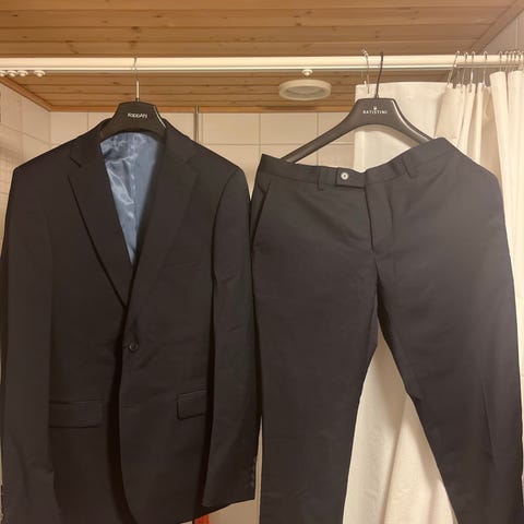 Myydään itselleni pieneksi jäänyt sininen Dressmannin puku. Paketti sisältää takin ja housut, sekä tumman kuvioidun kauluspaidan. Koot seuraavasti:
