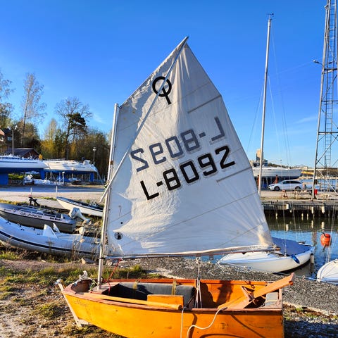 Optimisti jolla, lakattua puuta, optimistilla voitettu Suomen mestaruusmitalli