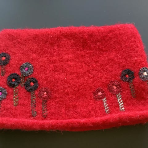 Lahjaksi saatu pieni kukkaro tunnetun Suomalaisen arvostettu käsityöllä Marjaanan Eliisan Sastamalasta.