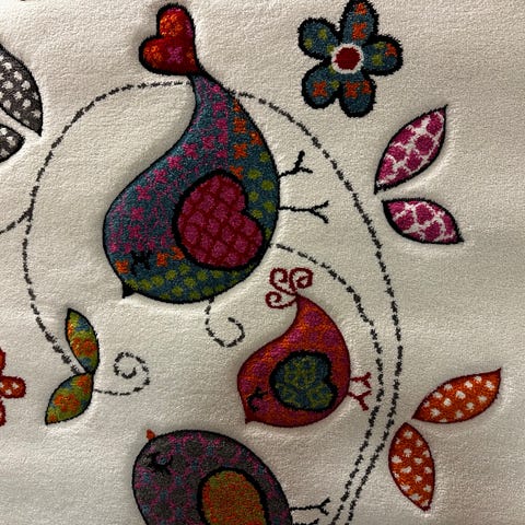 Mummilassa lastenhuoneen lattialla ollut erittäin hyväkuntoinen ja juuri pesty matto jossa pöllöjä / lintuja ja perhosia.