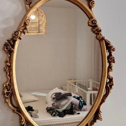 Antiikkinen peili. Peilissä on koristeellinen kehys ja se sopii hyvin sisustukseen. Peili on vapaasti seisova ja se voidaan sijoittaa eri huoneisiin.