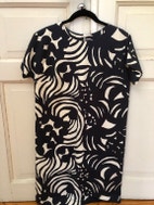 Marimekon Moma mekko. Aivan tummansininen printti valkoisella pohjalla. Vuoritettu, sivuissa piilotaskut. Suora malli.