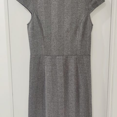 Myydään 34-koon kotelomekko, joka ulottuu polvien alapuolelle. Harmaaruudullinen, todella kiva, tyköistuva leikkaus