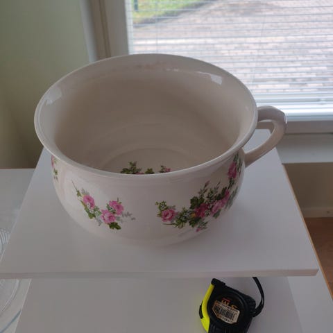 Hyväkuntoinen emalipotta vaikka kesällä mökkikäyttöön, kiva istua, perusväritys kerma ja vihreä raita. Korkeus 12,5 cm ja halkaisija 20,0 cm.