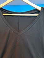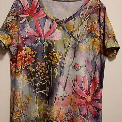 Perus T-paita. Polyesteria 100%. Venyy. Ilmoittaa kooksi 1XL, mutta näyttää isommalta. Kai-kai 55cm. OH 69cm. Levenevä helma.