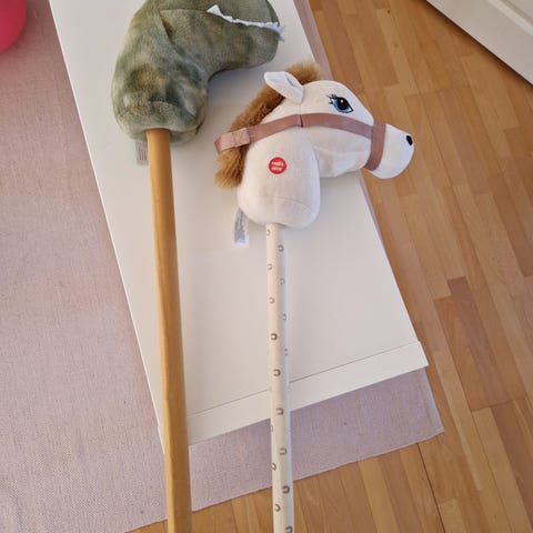 Käsintehty keppihevonen, kirja ja leluhevoset.
