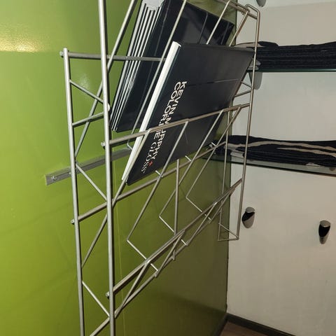 The standing newspaper/magazine holder has space for up to 30 magazines. Made of powder-coated steel. A modern minimalistic design. Perfect for home or office. Design: Ralph Kraeuter Measurements: 90 cm [35.4 in] high, 22 cm [8.7 in] wide, 16 cm [6.3 in] deep Material: powder-coated steel.