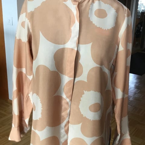 Kaksi kertaa päällä käynyt Marimekon Värssy -pusero. Hyväkuntoinen, todella kaunis paita. Väri beige-tummansininen. Koko 44. Takaa pituus 80cm.