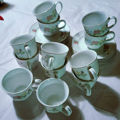 Myydään uuden veroinen ruusukuvioinen 12 hengen astiasto. Astiastoon kuulu kupit ja lautaset 12 hengelle sekä syvät ja matalat lautaset,