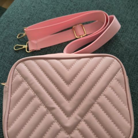 Vaaleanpunainen olkalaukku, jossa kimaltavia koristeita. Kaksi koristetta irronnut, katso 3. kuva. Laukussa on metallinen olkahihna joka on myös irrotettavissa. Laukussa on pieniä käytön jälkiä, mutta muuten hyvässä kunnossa.