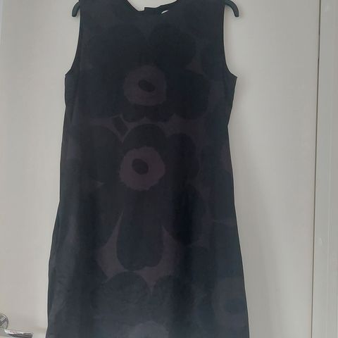 Siluetti-mekko on valmistettu puuvillasatiinista ja siinä on niukka istuvuus, A-linjainen leikkaus sekä Unikko-kuosi. Hihattomassa mekossa on pyöreä pääntie ja takasaumassa vetoketju. Sivusaumoissa on taskut.