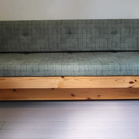 Myydään levitettävä laveri sänky/sohva. Mukana alle menevä pyörillä liikkuva vaatelaatikko. Sohvan kankaassa pieni ruhje. Levitettynä 140cm syvä