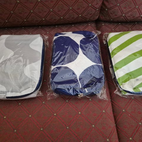 Myydään käyttämättömiä, uusia pussukoita. Sisällä silmälaput, korvatulpat, hammasharja & tahna.