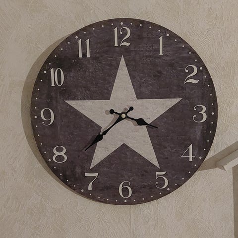 Kuvanmukainen seinäkello ,halkaisija 30 cm. Hinta 5€ (sis. pariston).