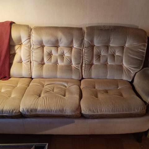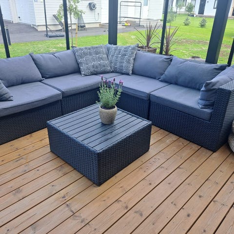 Lasitetulla terassilla ollut sohvaryhmä, päädyssä pöytä. Istuinosat ovat yhtenäiset, kuljetusta varten saa päätyosan erilleen. Pitkän osan pituus 230 cm. Harrastetilaan oikeinkin sopiva!