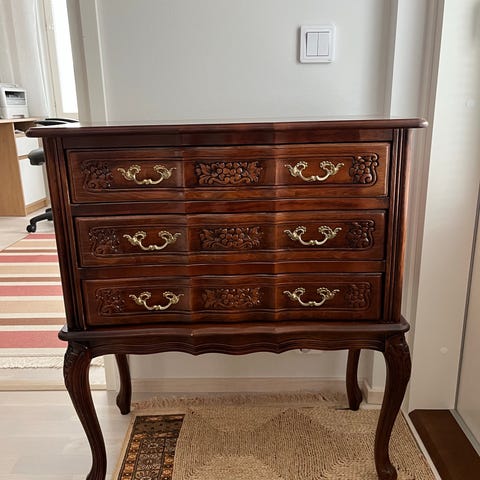 Pieni puinen rokokoo-tyylinen lipasto. Valmistettu Belgiassa 1950 - 1970 -luvulla.