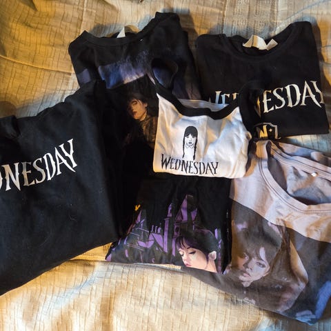 Myydään iso paketti Wednesday vaatteita seuraavalle fanille. Tytöllä loppui innostus joten nämä joutavat pois. Merkkeinä Zara ja Hm. Koko pääasiassa 158/164 cm mutta näitä on käytetty myös jo pienemmässä koossakin. Settiin kuuluu viisi t-paitaa, yksi yöpuku, yksi ohut neule ja kaksi collegepaitaa. Kunto kaikissa on todella hyvä. En huomannut tahroja tai reikiä. Myyn vain yhdessä! Nouto tai postitus, kulut ostajalle!
