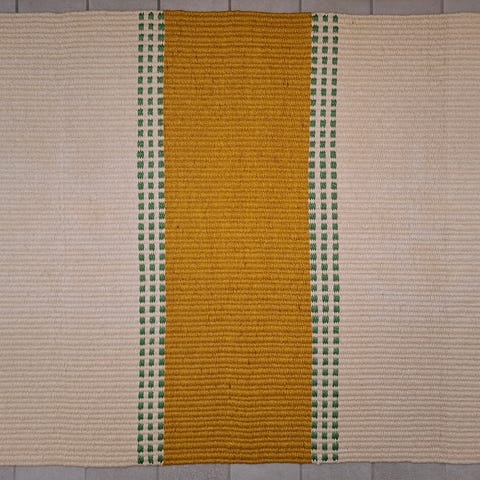 Puuvillamatto , pölyämätön hieman pörröisestä kuteesta , ei trikoosta , kaunis pehmeä keltalnen , päissä kapeat luonnovalkoiset raidat ! Ryhdikäs , tahraton pesty , taloudessa ei ollut eläimiä !