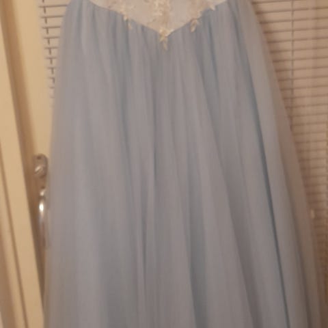 Tummansininen wanhojen mekko. Ommeltu läpinäkyvät olkaimet, saa varmasti purettua pois. Takana nyöritys joka antaa joustovaraa koon suhteen.
