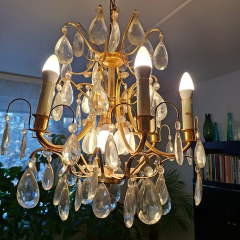 Kruunussa sähkölamput + kynttilät. 6 valopistettä, 8 kynttilää, 80 kristalliprismaa.