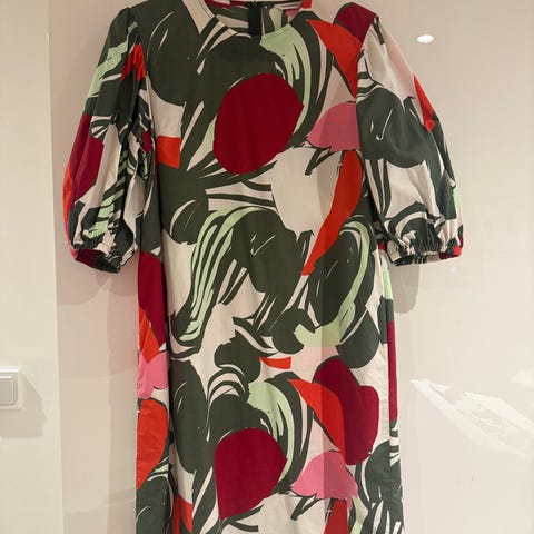 Uudenveroinen, en muista onko käytetty kertaakaan, nyt ei enää mahdu päälle. Koko 38. Ei tahroja eikä mitään muutakaan käytönjälkeä. Kangas on 100% ohutta puuvillaa, ei jousta. Takana pitkä vetoketju. Ei taskuja sivuilla.