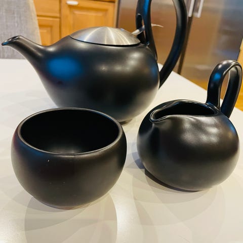 Kaunis tee/kahvisetti. Mukana 1x teekannu 6x pieniä teekuppeja 1x tarjotin. Koristeltu vaaleanpunaisin kukin sekä kultaisin yksityiskohdin. Kannun korkissa peini särö, korjattu.