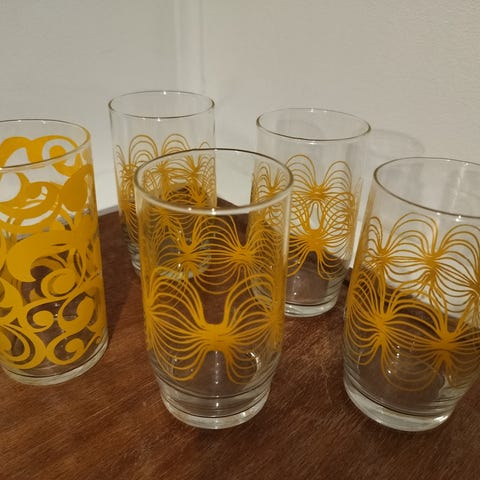 Vanhaa kotimaista hiottua lasia, kauniit kuviot. Kolme ohutta juomalasia ja pieni karahvi. Vintage.