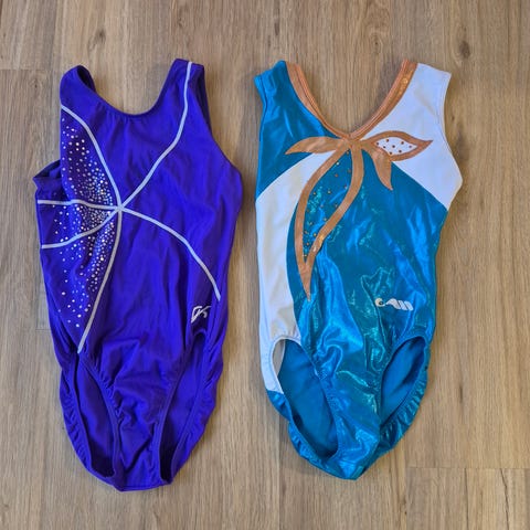 Neljä erilaista voimistelupukua (kts kuvat). Koko ilmoitettu kuvassa jos tiedossa (ne joissa ei kokoa, ovat samaa kokoluokkaa M-L/36-38).