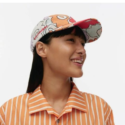 Marimekon Unikko lippahattu. Käyttämätön. Kooltaan säädettävä aikuisten koossa. Väriltään vaaleansininen-valkoinen.