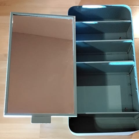 Käytetty IKEA peilikaappi missä on valmiiksi tehty reijat valoille. Katso mittoja kuvasta.