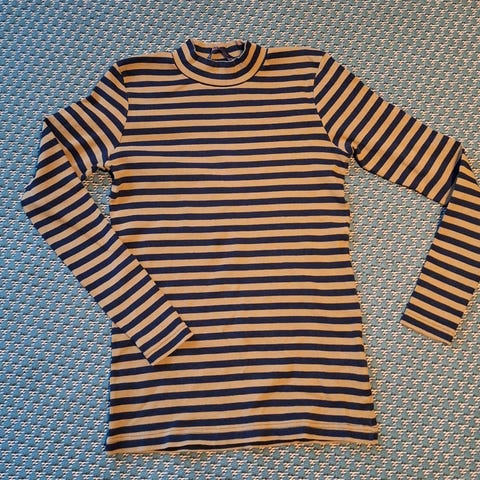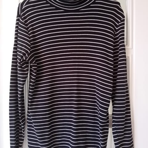Tyylikäs poolo musta - valkoiset raidat, k-k 48 (venyy), pit. 63. Poolo venyy leveyssuunnassa L-kokoon ja istuu hyvin. Nouto tai ärräpaketti +6 eur.