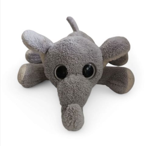 Pehmeä norsupehmolelu. Tämä ihana harmaa norsu on mukava halikaveri tai koriste lastenhuoneeseen. Silmät ovat isot, siniset ja kimaltavat.
