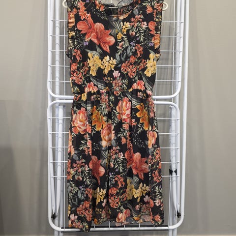 Mekko on Malesiasta tuotu, uusi/käyttämätön (toki sovitettu) ja siinä on hieman kellomainen helma. Rinnustassa muotolaskokset, takana piilovetoketju. Mekossa sisävuori, ei joustovaraa/ei jousta.
