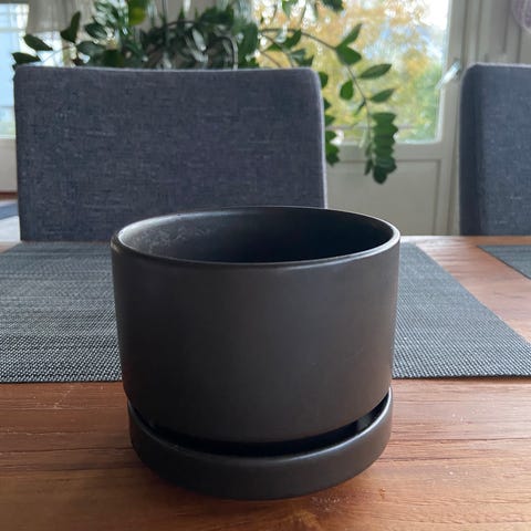 Musta SF-ruukku, halkaisija 17 cm, korkeus 12,5. Kalkkisaostumaa, ei aluslautasta. 8 e.