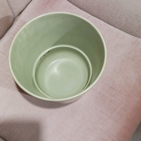 Vaalea ruukku halkaisija 20 cm, korkeus 15 cm. Krakea. Ei aluslautasta. (Mukaan saa sopivankokoisen Arabian lautasen.) 10 e.