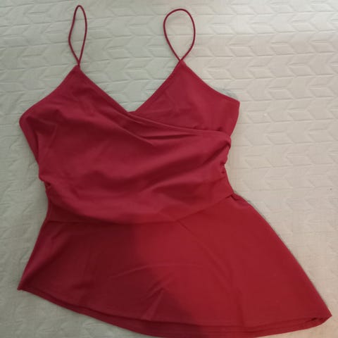 Viininpunainen toppi joustavaa materiaalia. Kaulus koristeltu strassikivillä