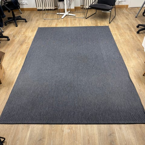 Tummanharmaa pitkä matto kestävää materiaalia, saa myös käsin pestyä hyvin.