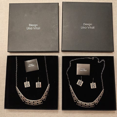 Kaulakorun pituus 45 cm, rannekoru 19 cm. Hopealeima 925 (92,5 Ag).