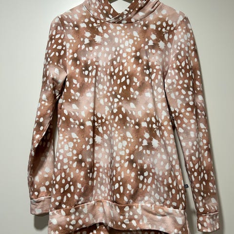 Uudenveroinen kerran pesty ja käytetty Kaikon luomupuuvillainen bambi-huppari. Ihanan pehmoinen materiaali. Hihansuussa resori samasta kankaasta, samoin helmassa. Ei taskuja. Reilu koko, sanoisin L. Jäänyt itsellä käyttämättä.