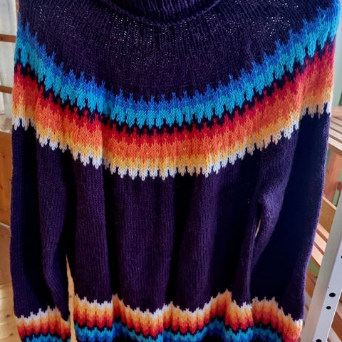 Villatakki perinteisellä Revontuli-kuviolla 160e. Koko XL. Mitat kai-kai 58cm, kai-helma 57cm ja hihan sisäpituus 56cm. Lanka Seitsemän veljestä.