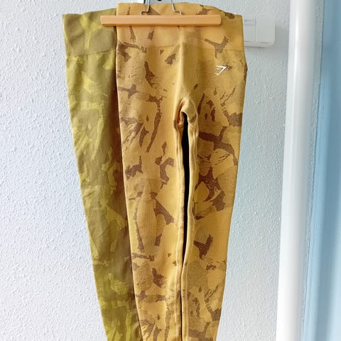Myydään vähänkäytetyt Gymshark harmaat treenileggingsit. Takana vaaleanpunainen GYMSHARK-logo. Koko S.