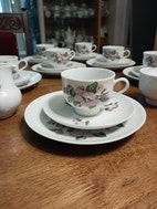 7 kuppia tasseineen ja leivoslautasineen, sokerikko ja kermakko. DDR
